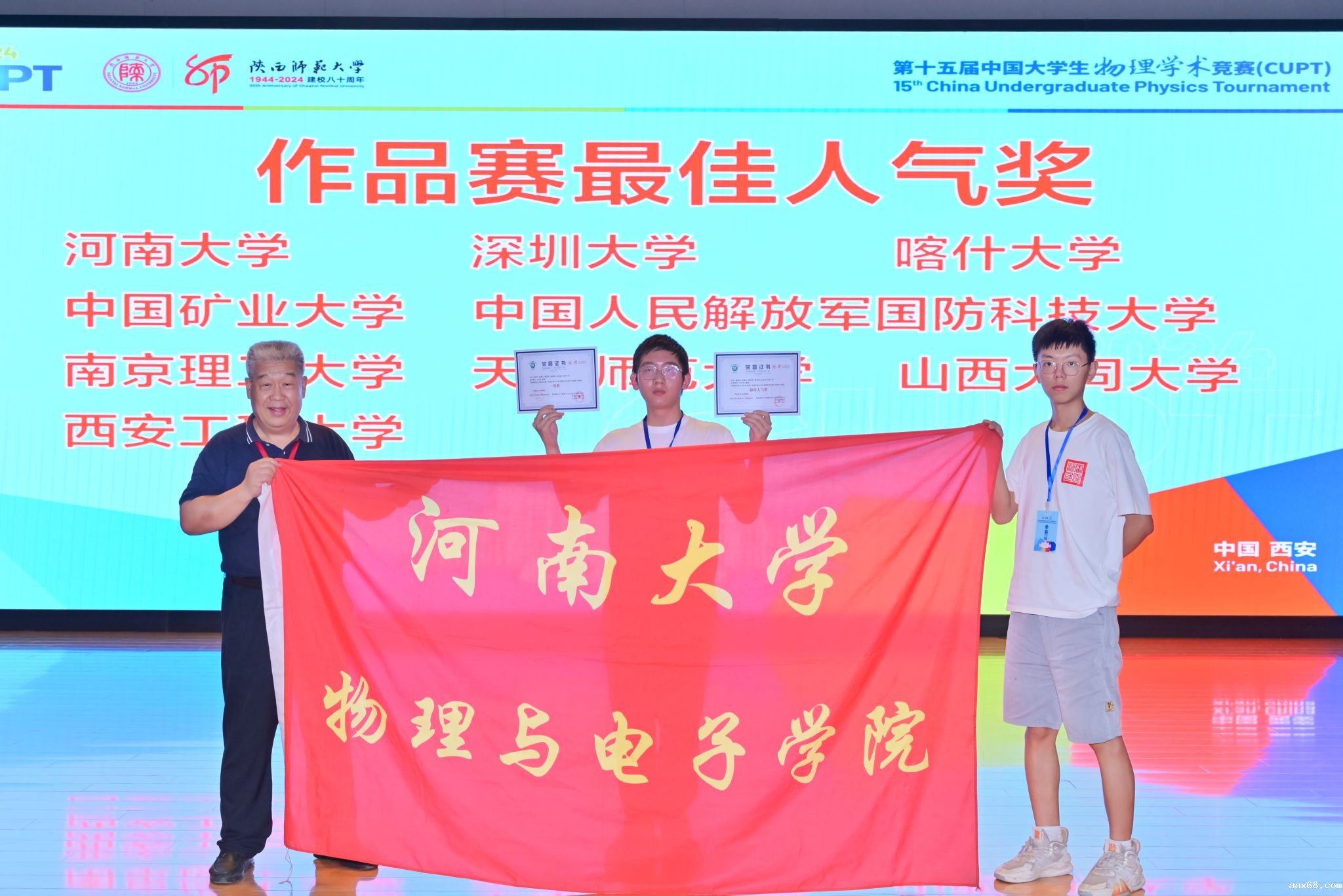 8月18日至23日,由中国大学生物理学术竞赛全国组委会主办、陕西师范大学承办的第十五届中国大学生物理学术竞赛(简称CUPT)在陕西西安举行。来自全国95所高校的96支代表队800余名师生参加了决赛。作为代表我校首次参赛的物理与电子学院秦豪宇代表队在指导老师刘平安、魏凌的带领下,获得全国作品赛一等奖、最佳人气奖第一名的好成绩!