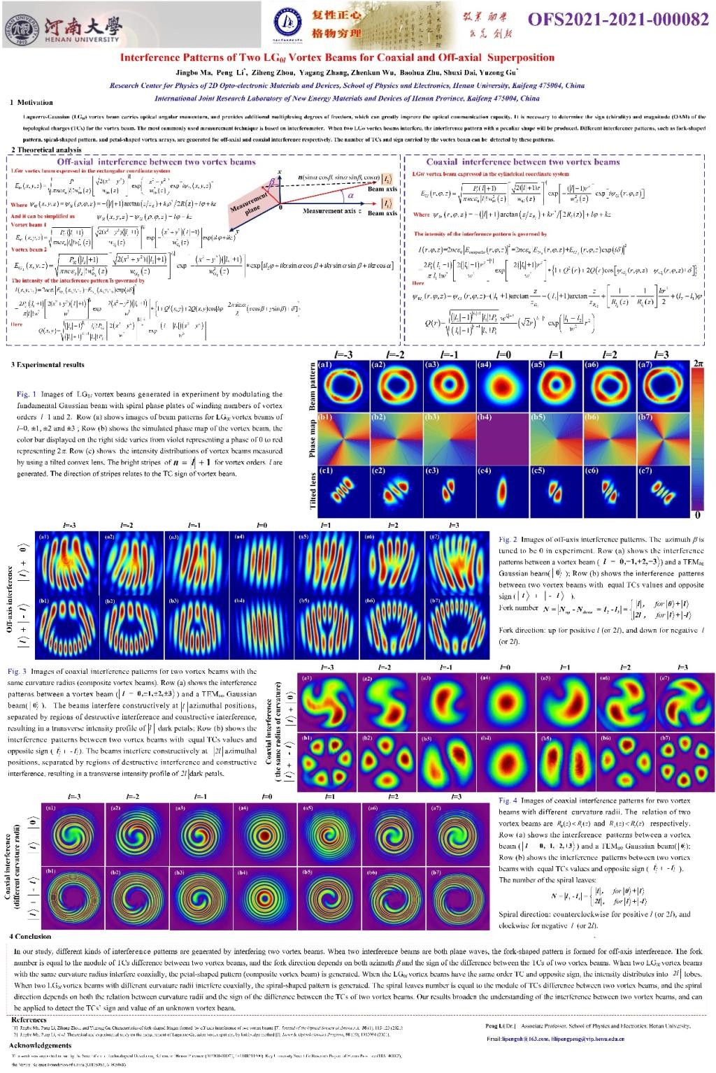 我院硕士生马靖博获奖的张贴报告论文在实验上系统研究了两束LG0l涡旋光的干涉特性,详细阐释了干涉图样与两束涡旋光的拓扑荷的符号和大小、空间位置关系(方位角)等之间的关系。该研究工作为涡旋光束的检测、手性微结构材料的加工和微粒的俘获与操控等方面的研究提供了重要指导。研究内容及实验结果得到大会组委会的一致认可。