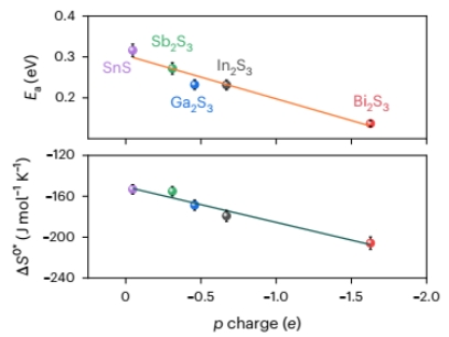 图3描述符:p-MS中硫的p电荷密度与硫还原反应的表观活化能(Ea)及吸附活化熵(∆S0*)之间的线性关系