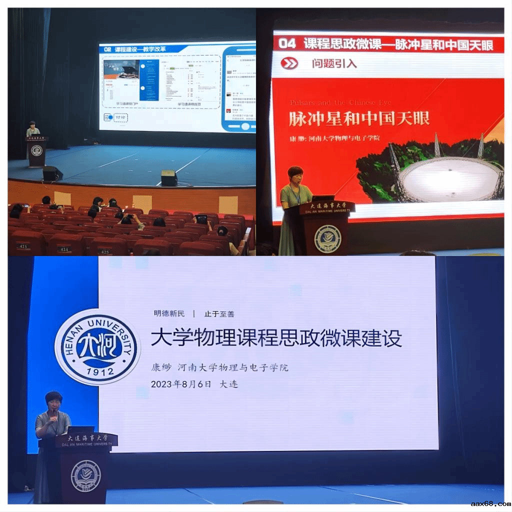 2023年8月5-8日,由教育部高等学校大学物理课程教学指导委员会课程思政工作委员会主办、大连海事大学承办的大学物理及大学物理实验课程思政研讨班在辽宁省大连市召开。来自清华大学、南京大学、西安交通大学、中国科技大学、中国矿业大学等近200名专家学者参加此次会议。我院大学物理教研室教师康缈、任凤竹和李若平应邀参加了此次会议,康缈在会上作了题为《大学物理课程思政微课建设》的主题报告。